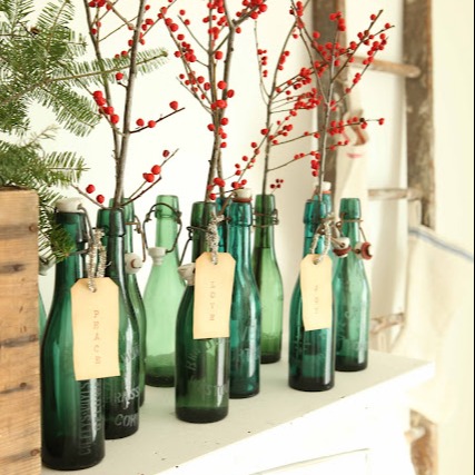 "Modern, simple holiday decorating can be easier than you think! I love to fill bottles and jars that we already have with evergreen branches or berries. You can leave an assortment of them mismatched, or try painting jars of different shapes and sizes all in one color and group them together for a stunning dining table centerpiece."